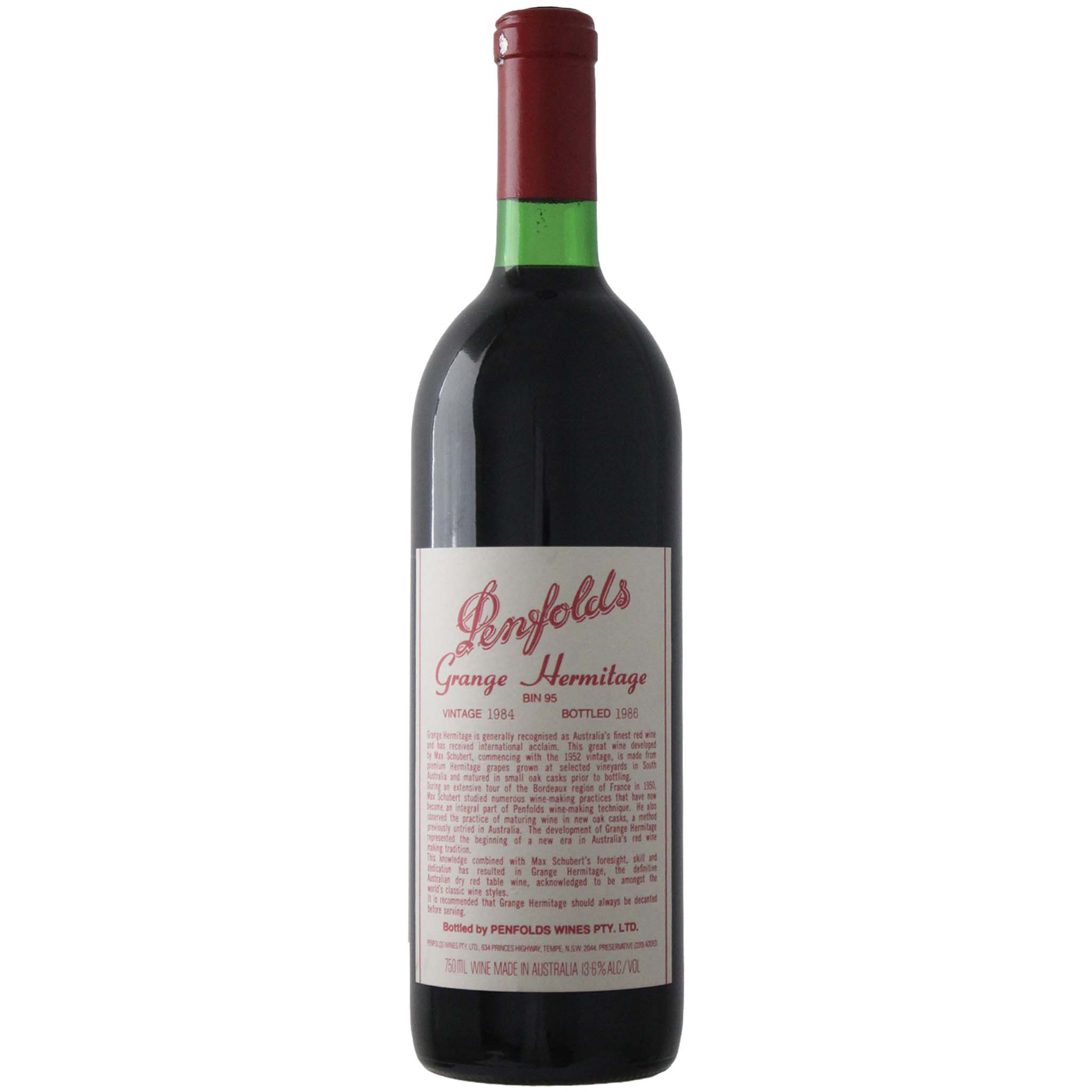 The 1984 Penfolds Grange is a blend of 95% shiraz and 5% cabernet sauvignon from the famed Kalimna Vineyard (Barossa Valley), and other premium vineyards in the Barossa Valley, Magill Estate (Adelaide), McLaren Vale, Clare Valley and Coonawarra.